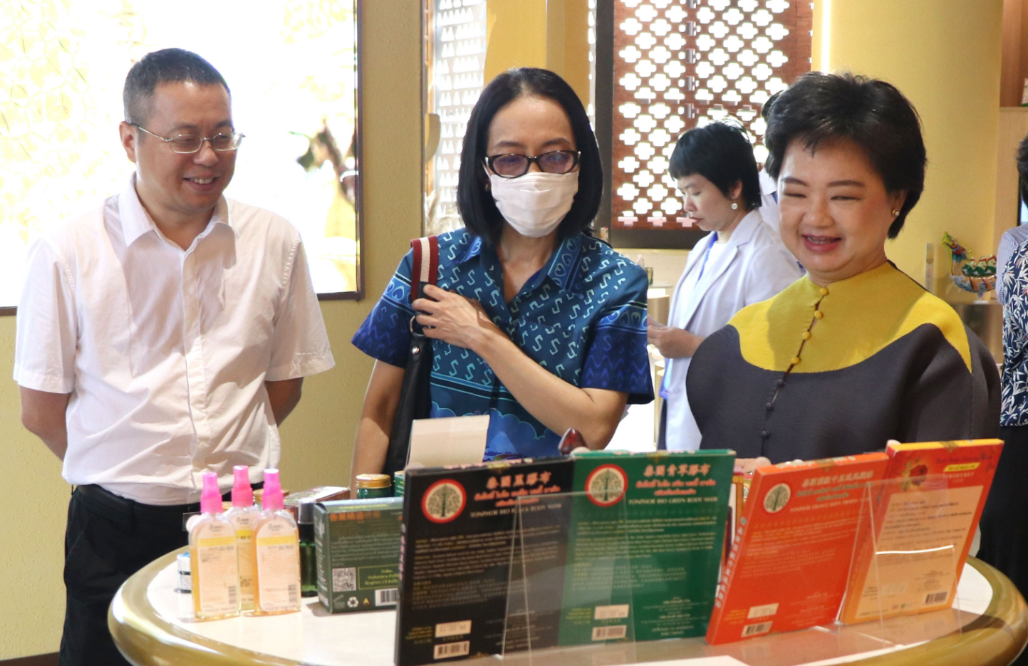 婉娜蓬·戈杜塔等泰國商業(yè)部巡視員、中國—東盟特色商品匯聚中心副總經(jīng)理盧春梅等陪同考察。
