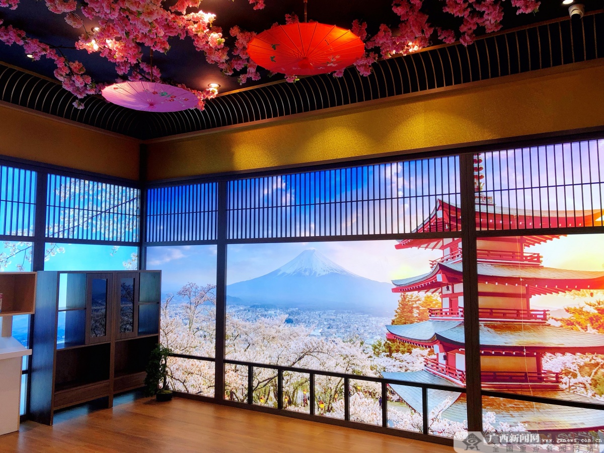 “我們現(xiàn)在看到的是‘春之色’部分,以最具有日本代表性的富士山與櫻花元素為春季設(shè)計(jì)核心,造型意向來自日本京都琉璃光院,讓人仿佛置身于一個與富士山隔空眺望的禪院。接下來,這里是‘夏之聲’部分,里面包含了許多日本動漫元素,其中不乏我們熟知的宮崎駿、手冢治蟲等大師的作品展示,‘秋之韻’部分融合了日本秋天的楓葉美景;‘冬之盼’部分主要體現(xiàn)的是日本高科技技術(shù)”中國—東盟特色商品匯聚中心招商部RCEP區(qū)域高級經(jīng)理梁曉婷介紹道。