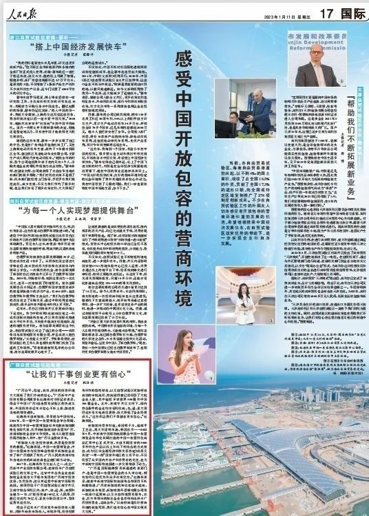 1月11日,《人民日?qǐng)?bào)》第17版刊登《感受中國(guó)開放包容的營(yíng)商環(huán)境》的報(bào)道。得益于中國(guó)(廣西)自由貿(mào)易試驗(yàn)區(qū)的快速發(fā)展,外國(guó)投資者切身感受著開放包容的營(yíng)商環(huán)境和蓬勃發(fā)展的機(jī)遇,加速在當(dāng)?shù)氐脑鲑Y進(jìn)資。其中采訪了廣西新中產(chǎn)業(yè)投資有限公司董事長(zhǎng)趙海燕,相關(guān)報(bào)道摘錄如下: